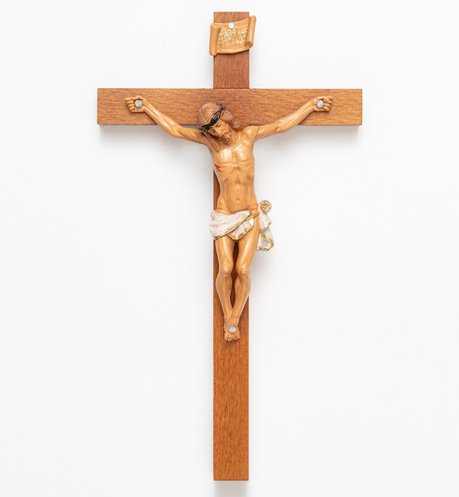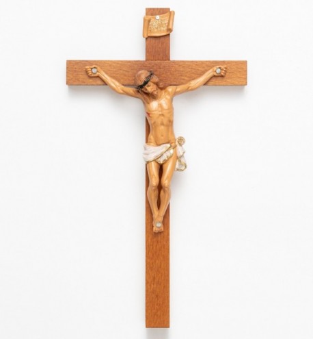 Pensato per pareti domestiche o cappelle, questo crocifisso è realizzato in legno e PVC e rifinito con pittura artigianale, conferendo carattere e calore al prodotto. Le sue dimensioni lo rendono ben visibile senza risultare ingombrante, ideale per uno spazio dedicato alla contemplazione.